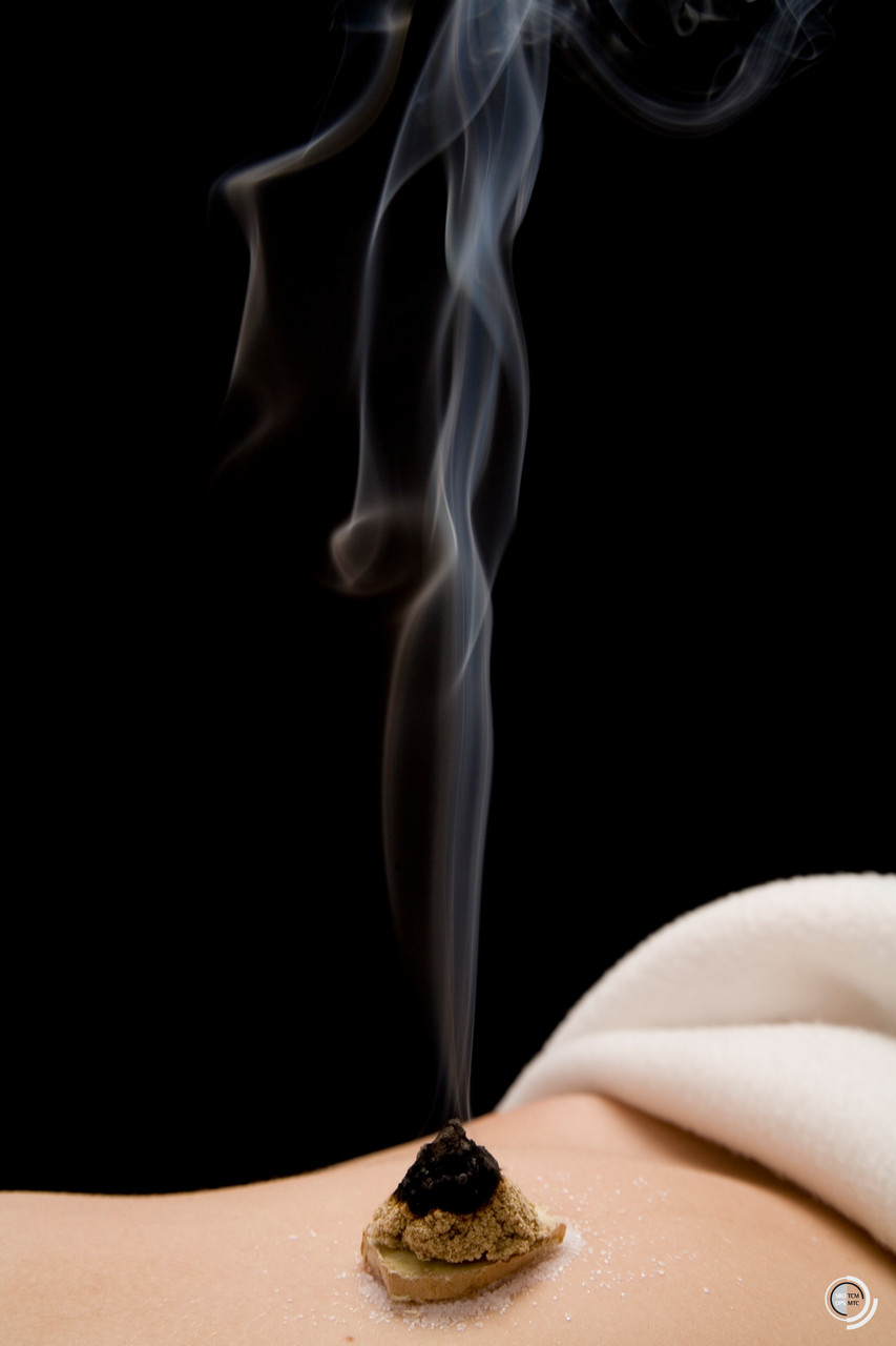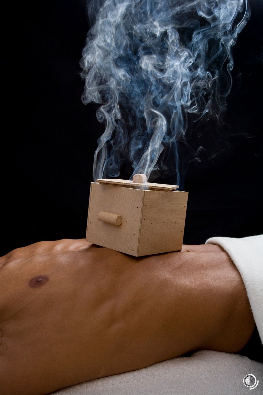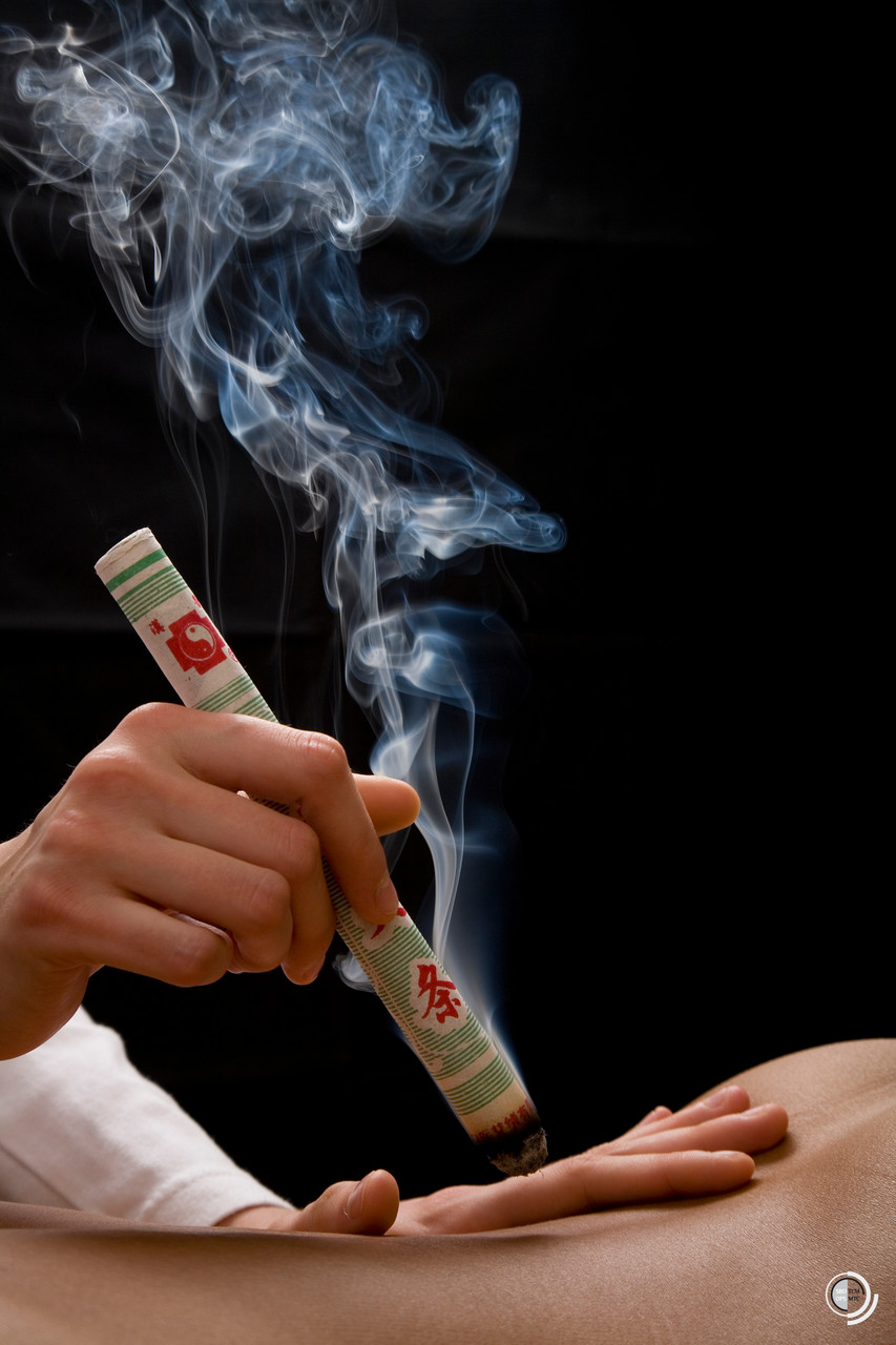 Akupunkturpunkte oder Hautzonen werden durch die Wärme des abbrennenden Beifusskrauts stimuliert.